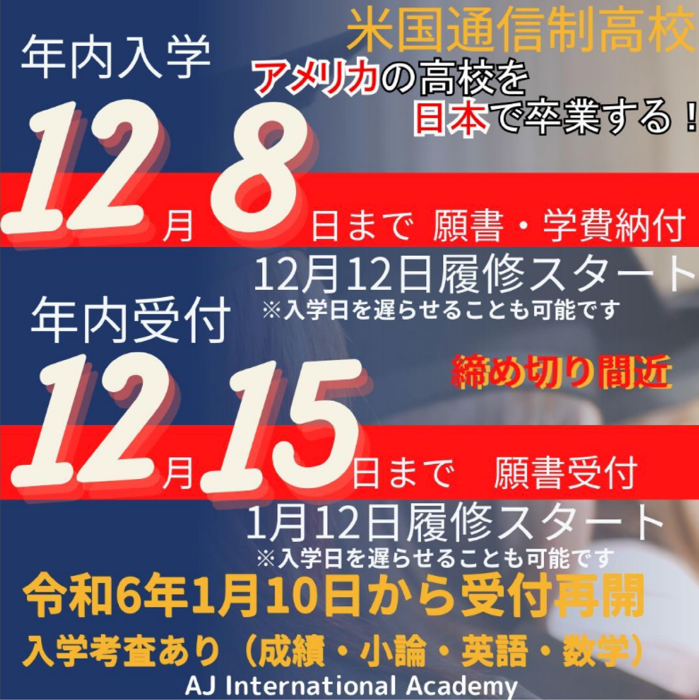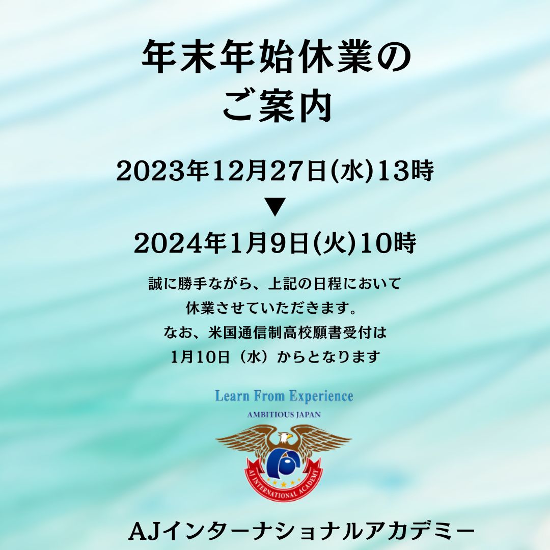 2023年12月13日 / 最終更新日時 : 2024年1月10日 InternationalAJ お知らせ 年末年始休業 年末休業のご案内(2023~2024) 休業:12月27日(水)13時~1月9日(火)10時 2023年末の出願受付 年内の入学の願書:12月8日まで 年内の願書受付:12月15日まで(年明け入学) 入学をお考えの方は、お早めにご出願ください。 なお、年明けの願書受付は、1月10日からとなり、米国通信制高校入学考査(入学試験)を導入します(現中学生対象)。 入学考査は、過去2年分の成績(出せる方)、小論(日本語または英語)、英語、数学のテストを実施します。 詳しくは、お問い合わせください。