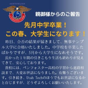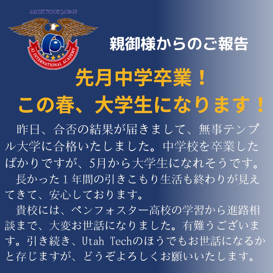 2024年4月3日 / 最終更新日時 : 2024年4月22日 InternationalAJ お知らせ 進路についてうれしいご報告 AJ生の親御様から、進路についてうれしいご報告メールを頂きました。 日本の中学2年生を終えて、AJに入学。 しっかりと丁寧に勉強を進め、日本の中学校を卒業前に、アメリカの通信制高校を卒業しました。 成績(GPA)も、4段階で3.88。立派。 先月、日本の中学を卒業したばかり。 この春、大学生になります。