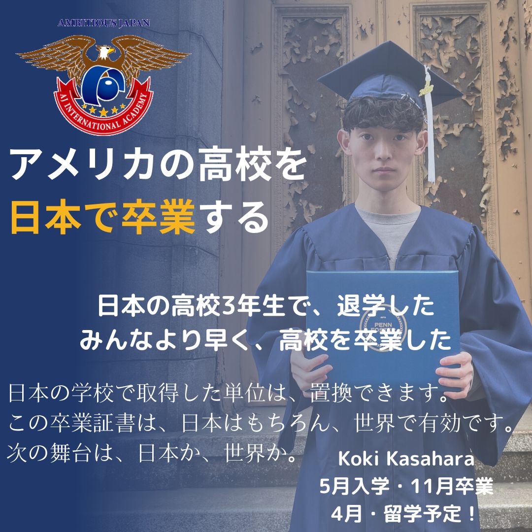 2023年12月5日 / 最終更新日時 : 2023年12月5日 InternationalAJ お知らせ 高校3年生で、中退 高校3年生で、中退。 結構多くいらっしゃいます。 コロナ禍で生活が不規則になったり、先の見えない社会に精神的に不安定になったり、その理由は様々。 でも、大丈夫。高校3年生までがんばって取った単位は、アメリカの通信制高校にも置換できます。 がんばれば、数か月で卒業も可能。進路が見えてきます。 年内の入学は12月8日まで。 年内の受付(年明け以降の入学)は12月15日までです。