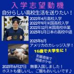 2023年6月28日 / 最終更新日時 : 2023年7月27日 InternationalAJ お知らせ 2022年9月入学-12月高校卒業 米国通信制高校 2022年9月入学-2022年12月卒業 6月26日に出発したばかりのMちゃん16歳。 これから、カレッジ生活がはじまります。 無事到着したようで、安心しました。 眠いね。うん。がんばれ♪ […]